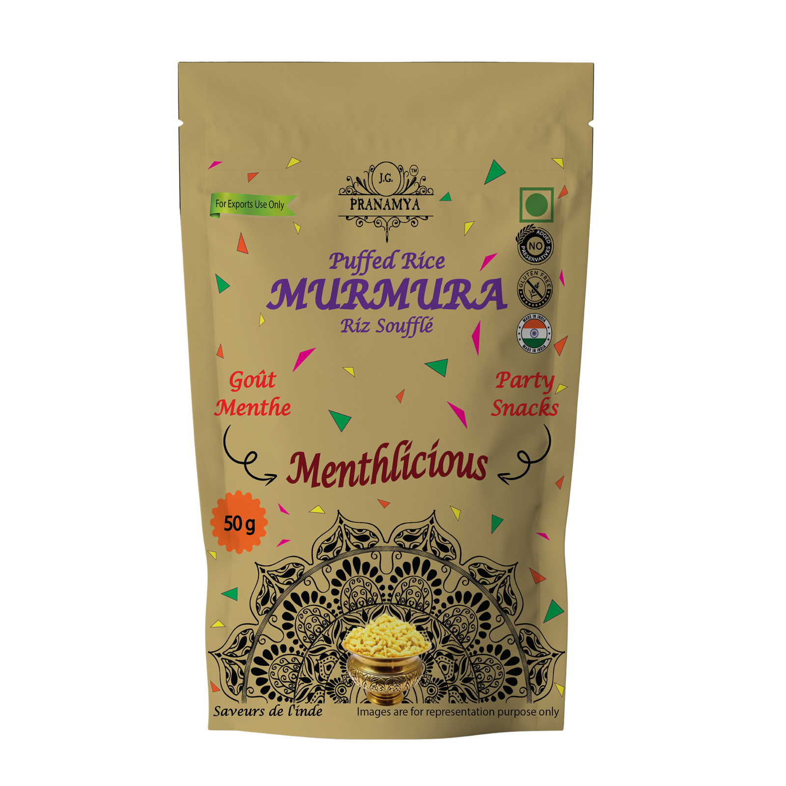 Puffed Rice/ Riz Soufflé 89%, Maltodextrin/Maltodextrine, Iodised Salt/Sel Iodé, Starch/Amidon, Tamarind Powder/Poudre de Tamarin, Black Salt/Sel Noir, Amchur Powder/Poudre de Mangue Sèche, Anticaking Agent (INS341(iii), INS551)/Agent Anti-agglomérant, Garlic Powder/Poudre d’ail. For remaining ingredients please refer to the back of product pouch/Pour les autres ingrédients, veuillez vous référer au dos de l’emballage du produit.